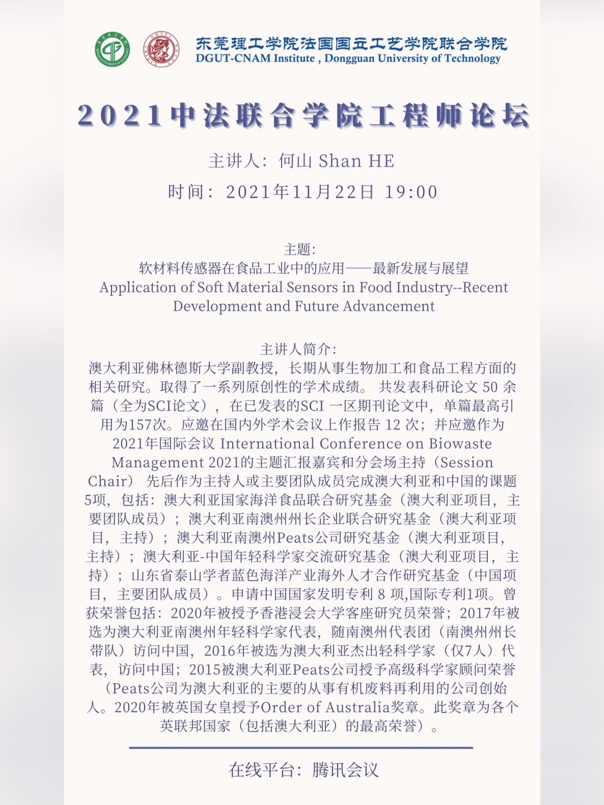 2、何山博士为学生开设《软材料传感器在食品工业中的应用——最新发展与展单》主题讲座。澳大利亚佛林德斯大学副教授,长期从事生物加工和食品工程方面的相关研究。取得了一系列原创性的学术成绩。 共发表科研论文 50 余篇(全为SCI论文);应邀在国内外学术会议上作报告 12 次;并应邀作为2021年国际会议 International Conference on Biowaste Management 2021的主题汇报嘉宾和分会场主持(Session Chair) 先后做为主持人或主要团队成员完成澳大利亚和中国的课题5项,包括:澳大利亚国家海洋食品联合研究基金(澳大利亚项目,主要团队成员);澳大利亚南澳州州长企业联合研究基金(澳大利亚项目,主持);澳大利亚南澳州Peats公司研究基金(澳大利亚项目,主持);澳大利亚-中国年轻科学家交流研究基金(澳大利亚项目,主持);山东省泰山学者蓝色海洋产业海外人才合作研究基金(中国项目,主要团队成员)。申请中国国家发明专利 8 项,国际专利1项。曾获荣誉包括:2020年被授予香港浸会大学客座研究员荣誉;2017年被选为澳大利亚南澳州年轻科学家代表,随南澳州代表团(南澳州州长带队)访问中国,2016年被选为澳大利亚杰出轻科学家(仅7人)代表,访问中国;2015被澳大利亚Peats公司授予高级科学家顾问荣誉(Peats公司为澳大利亚的主要的从事有机废料再利用的公司创始人。2020年被英国女皇授予Order of Australia奖章。此奖章为各个英联邦国家(包括澳大利亚)的最高荣誉)。