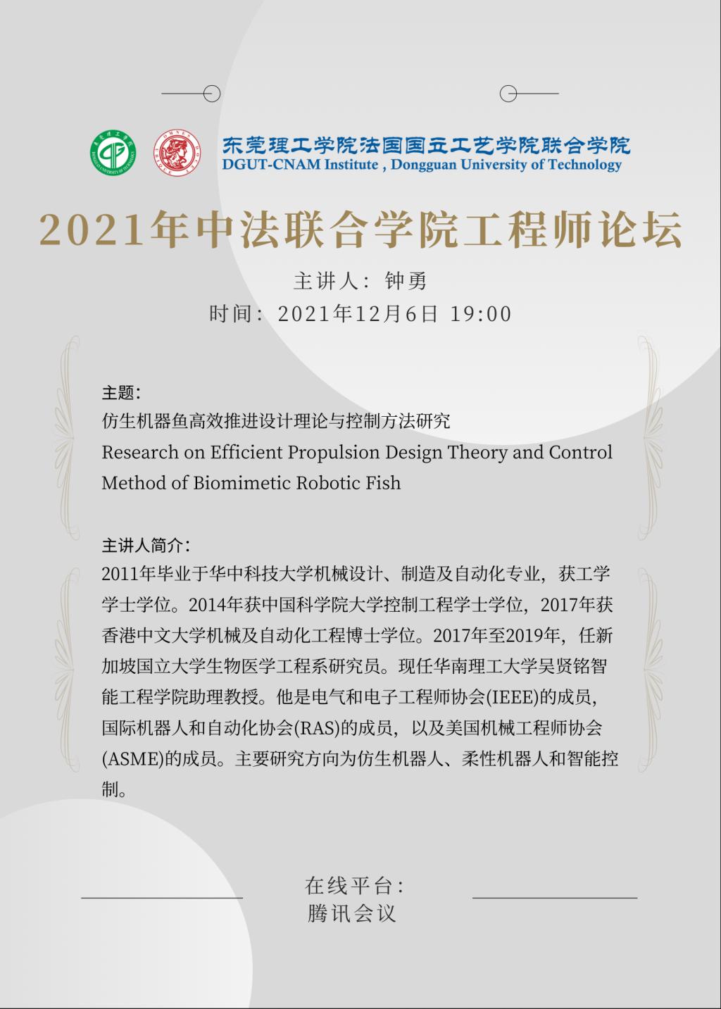 3、钟勇博士为学生开设《仿生机器鱼高效推进设计理论与控制方法研究》主题讲座。钟勇博士2011年毕业于华中科技大学机械设计、制造及自动化专业,获工学学士学位。2014年获中国科学院大学控制工程学士学位,2017年获香港中文大学机械及自动化工程博士学位。2017年至2019年,任新加坡国立大学生物医学工程系研究员。现任华南理工大学吴贤铭智能工程学院助理教授。他是电气和电子工程师协会(IEEE)的成员,国际机器人和自动化协会(RAS)的成员,以及美国机械工程师协会(ASME)的成员。主要研究方向为仿生机器人、柔性机器人和智能控制。