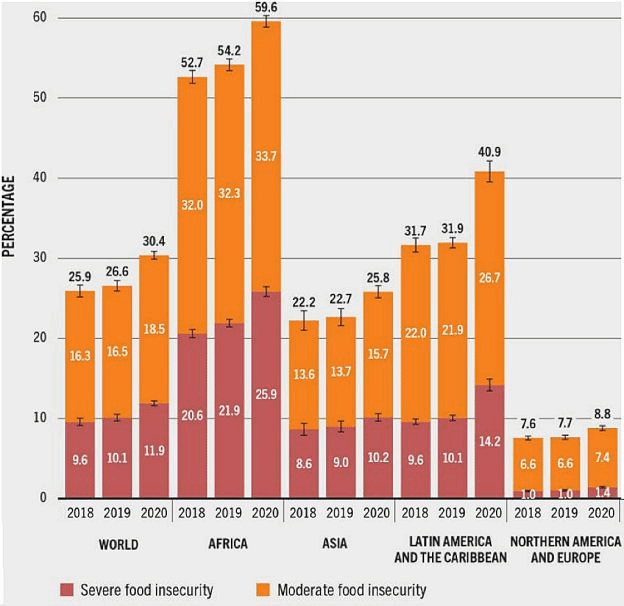 The following chart is about the state of food security and nutrition around the world between 2018 and 2020. Summarize the information by selecting and reporting the main features, and make comparisons where relevant. Write at least 300 words.