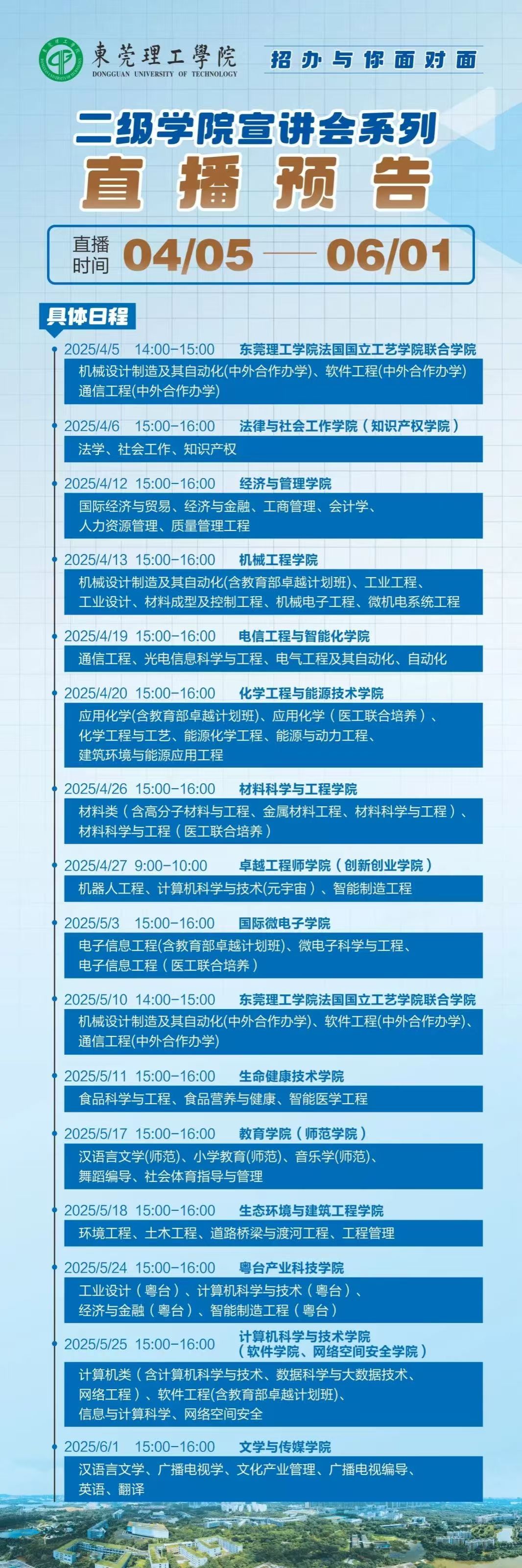 东莞理工学院2025年线上招生宣讲会将于2025年4月5日至6月1日开展。