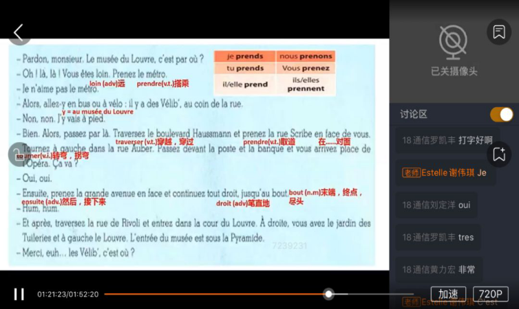 双平台并用,避免优学院直播拥堵。。为了保障教学质量,法语类课程全部采用直播的方式。为避免优学院直播拥堵,老师们各自选择了自己熟悉的直播APP,直播基本流畅,作业、讨论、小测等仍使用优学院平台,双平台并用,保障了线上教学的顺利进行