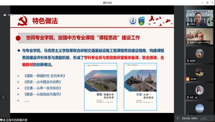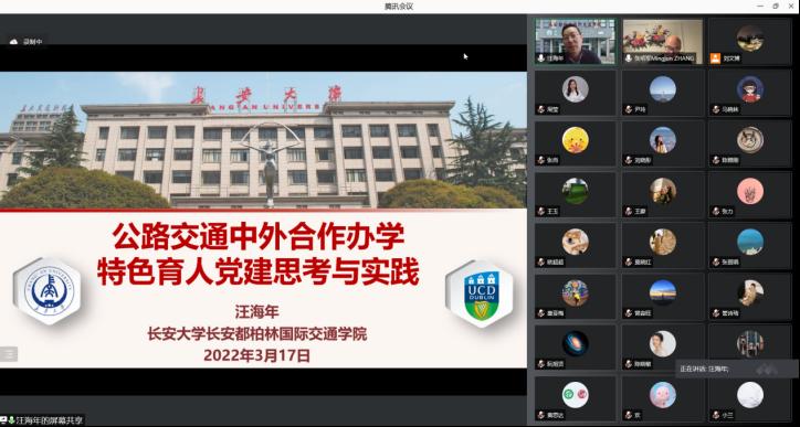 汪海年教授深刻剖析了中外合作办学机构由于教师结构多元化、学生特点鲜明等原因,在全面推进立德树人、课程育人方面面临的挑战,并从长安都柏林国际交通学院概况、党建工作、课程思政建设三个方面分享了中外合作办学特色育人的思考和实践。汪海年教授阐述了筑牢师生思想根基、把牢意识形态阵地的重要性和做法,例如开展具有中外合作办学特色的双语、多文化教育活动,坚持听课制度,建立党组织服务平台等。