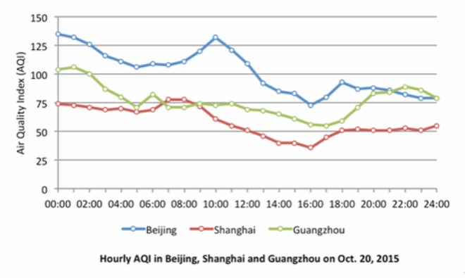 The chart shows the hourly AQI (Air Quality Index) in Beijing, Shanghai and Guangzhou on the same day. In your writing, you should summarize the information by selecting and reporting the main features and make comparisons where relevant. You should write at least 300 words.
