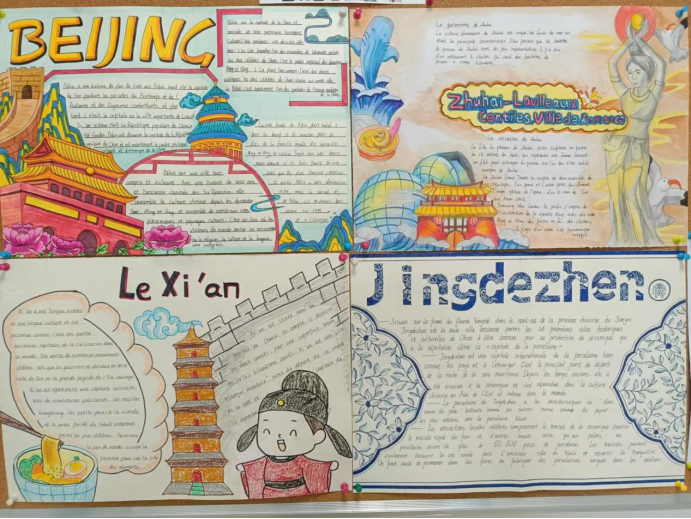 经过半个多月的筹备,2023年4月,sunbet官网开展了第二届法语手抄报比赛,并于近期落下帷幕。参赛学生积极挖掘具有中华传统象征意义的文化符号,和代表新时代中国特色社会主义发展成就的地域标识,搜集大量素材,认真准备,根据资料文献和切身体会,充分发挥自己的创意和想象力,用所学法语,以色彩鲜艳、图文并茂的手抄报向中法师生展示了自己所喜爱的中国城市的自然风光、历史文化及美食文化等内容,讲出了这些城市的故事,深入感受中华民族文化的独特魅力。