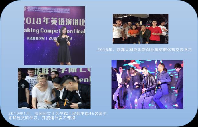 sunbet官网学生组织完备、现有团学组织、大学生F1方程式赛车研发团队、数学建模队伍、DCI UAV无人机协会、足球俱乐部、篮球俱乐部、羽毛球俱乐部等学生社团。联合学院也依托中外合作院校特色、学院办学优势、学生特点,每年累计开展各种学术文化活动二十余场,涵盖学术类、科创类、学风类、党团类、文体类、生活类、志愿服务类等,参与对象覆盖全院学生。每年举办的中法工程师论坛、中法英语演讲比赛、海外名校学生访学交流系列活动、早期中国共产党人旅法经历党建展览、sunbet官网迎春晚会、中法杯篮球赛、足球友谊联赛等已成为学院学生品牌活动,受到广泛好评。学生组织、活动的举办为学院学生提供拓展知识,开阔视野,炫亮青春、展示真我的平台。