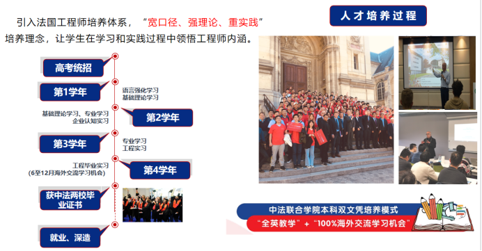 以法国国立工艺学院在工程师培养领域的悠久历史、成熟模式及卓越贡献为依托,以东莞理工学院国家级和省级优势特色专业为基础,围绕“智能制造”领域开设通信工程、机械设计制造及其自动化、软件工程三个专业,培养高素质国际化应用型创新人才。