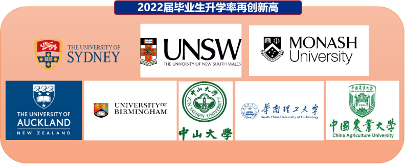 截至目前,2022届毕业生中多人已收获全球多所高校录取通知书,同期相比再创新高。学生其中包括被悉尼大学(QS38)、新南威尔士大学(QS43)、莫纳什大学(QS58)、奥克兰大学(QS85)、伯明翰大学(QS90)、谢菲尔德大学(QS95)、都柏林大学圣三一学院(QS101)、诺丁汉大学(QS103)、南特中央理工(法国工程师学院排名第5)、大西洋矿业电信学校(法国工程师学院排名第9)、中山大学、华南理工大学、华南师范大学、中国农业大学等国内外知名大学录取。