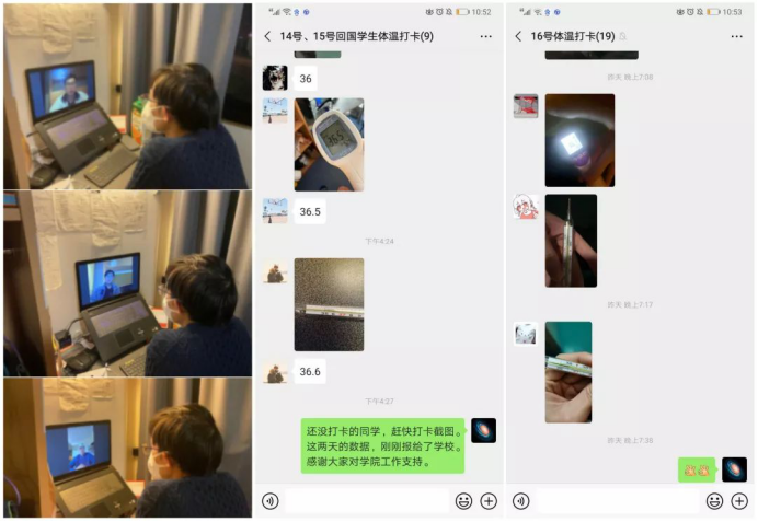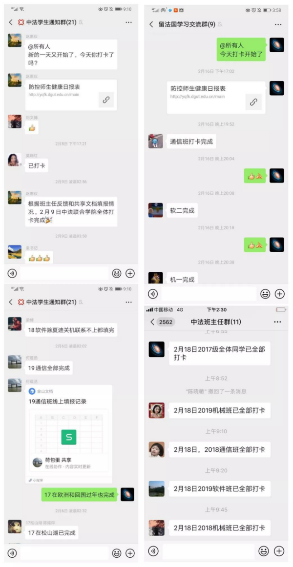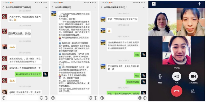 学院每日在学生工作群上实行班级学生健康自报班长负责制,实行班干轮流值日制度,调动班主任协同抗疫,进行防控提醒、健康自报提醒、学生活动情况、身体情况统计、汇总,包括学院在国内的各年级以及在法国的全部学生。学院统计工作克服不同时区、不同地域限制,实现对全院学生全覆盖、全观察。