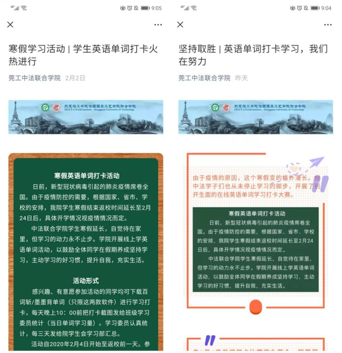 按照广东省教育厅、东莞理工学院防疫工作要求,学生新学期延迟开学,具体返校时间根据疫情情况另行通知。寒假延长,但停课不代表停学,sunbet官网团总支、学生会,团学学习部策划了线上“英语单词打卡”活动,鼓励同学们假期坚持学习,提升自己的英语水平。