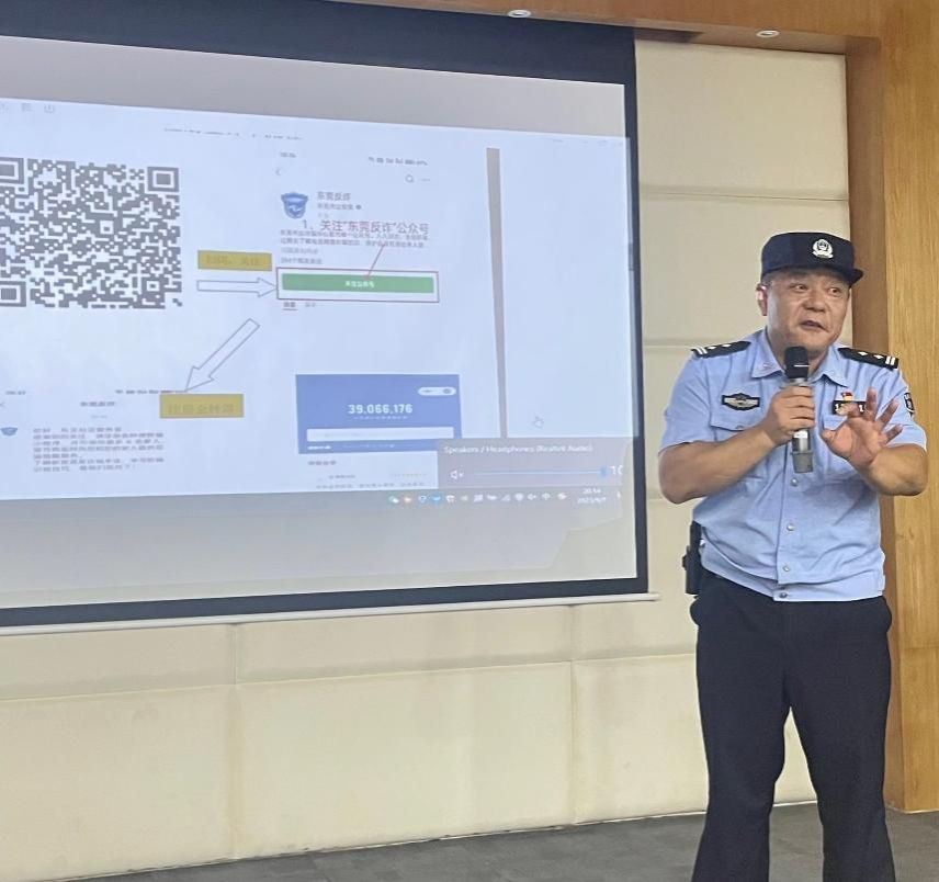 本次讲座邀请莞城刑侦大队副大队长石智峰、莞城分局北隅派出所唐曙光警长、学校保卫处老师谭润孙参与讲座,学院副院长郑华、教师代表,全体23级新同学参加活动。