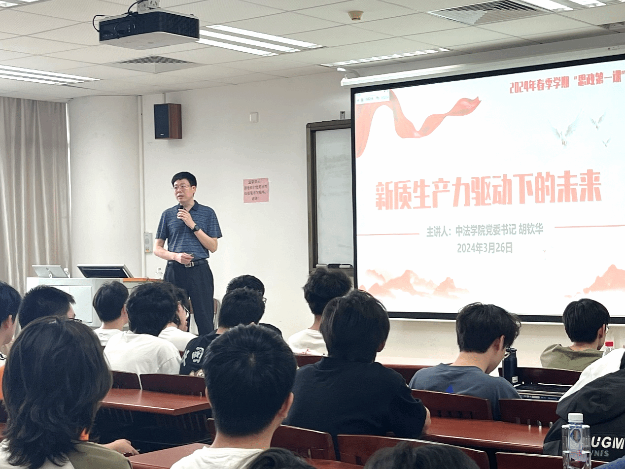 为深入学习宣传习近平总书记关于发展新质生产力的重要论述,把思想和行动统一到习近平总书记关于发展新质生产力的重要论述和党中央决策部署上来,3月26日下午,sunbet官网党委书记胡钦华为21级全体同学开讲了一堂生动而富有启发性的思政课。
