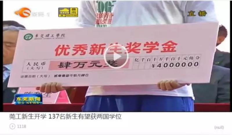 开学典礼上,东莞理工学院派出68万元“大红包”作为新生奖学金,用来奖励32名优秀新生,其中12名新生获得4万元的超大“红包”,部分获奖新生的高考分数比该校的录取分数线高出了近百分之多。东莞理工学院名誉校长杨振宁发来了讲话视频,他通过分享自己的求学经历,鼓励大学新生用努力学习来赢取美好的明天。