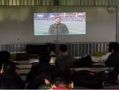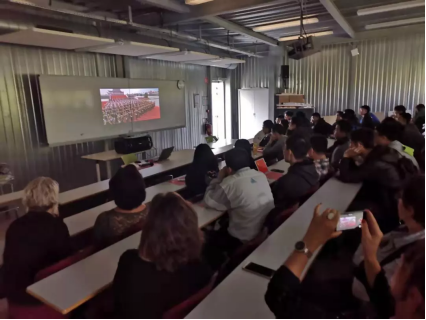 收看视频现场,同学们聚精会神并不时发出阵阵赞叹声,大家看到受阅部队官兵以严整的军容、雄壮的气势、昂扬的精神通过天安门广场接受检阅,看到这么多的先进军事装备展示亮相,看到游行群众分“建国创业”“改革开放”“伟大复兴”三个篇章展现中国共产党团结带领全党全国各族人民从站起来、富起来到强起来的伟大征程,感到无比激动和自豪,纷纷表示,作为青年一代,身在异国他乡,要不忘初心,心系祖国,发奋图强,刻苦学习,为加强中法两国友谊贡献力量,为把祖国建设得更美好贡献力量。