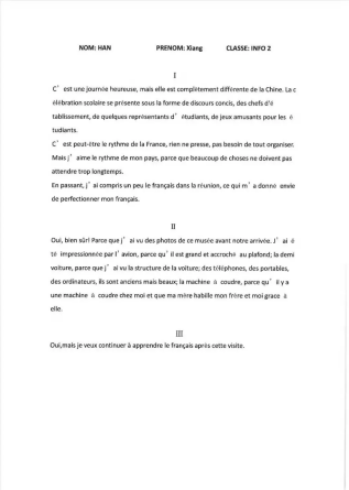 Grâce aux réponses des élèves à notre questionnaire, je constate leur fort intérêt , et les progrès qu'ils ont fait dans l'apprentissage du français. A la fin, je tiens également à remercier tous nos étudiants pour leur soutien et leur coopération dans l'étude parascolaire de cette journée.