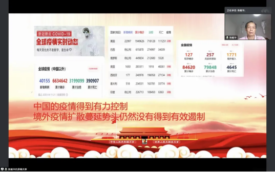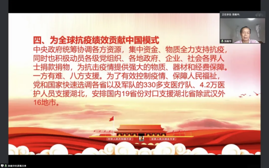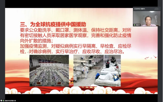 首先,陈毅华院长通过援引数据向同学们分析当前全球抗疫态势。新型冠状病毒引发的肺炎疫情发生以来,中国对于疫情的防控工作落实到位,最大程度保障了中国人民生命健康。目前中国疫情得到有效遏制,然而境外疫情仍然处在抗疫攻坚期。在本次抗击疫情中,中国与全世界休戚与共。中国及时向世界卫生组织及相关国家和地区通报疫情信息,向多个国家和国际组织提供了紧急的医疗救援。这强有力的回击了部分西方国家对中国抗疫存在的不实指控。陈院长强调,中国的抗疫既是为了保护中国人民的生命安全和身体健康,也是对全球公共卫生事业和人类命运福祉尽责。