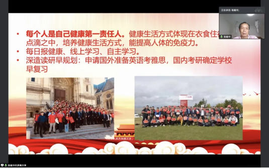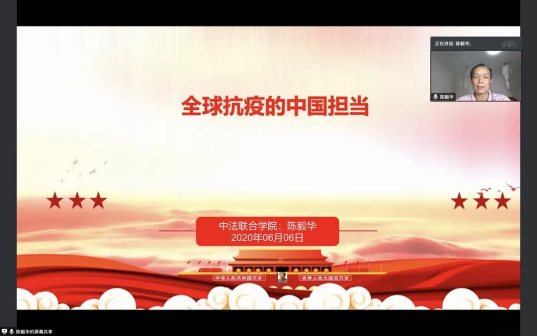 2020年6月6日,北京时间下午3:30,法国时间上午9:30,sunbet官网直属党支部书记、执行院长陈毅华以“全球抗疫的中国担当”为主题,为学院2017级留法学习学生讲授在线思政课。