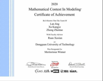 2020年有三名学生在世界最顶级国际比赛——美国大学生数学建模竞赛取得一等奖(Meritorious Winner)好成绩。