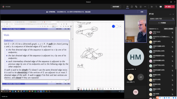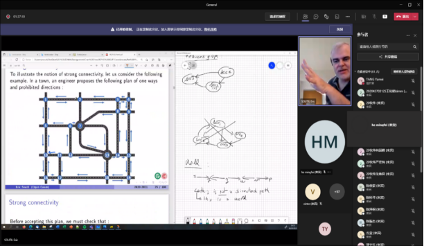 Eric Soutil教授讲授的《建模,优化,复杂性和算法(Modeling, Optimization,Complexity and Algorithms)》课程,主要从Graphs的各类定义、性质与其运用展开,并由小及大、细致入微地讲授了相关知识。在课堂上,Eric Soutil教授绘声绘色地讲授知识点,利用作图等方式给予学生更直观的解题思路。教授还善于运用引导式提问,让学生们均参与其中,为学生答疑解惑,既提升了学习氛围也激发了学生对专业课程的兴趣。