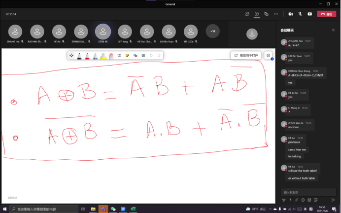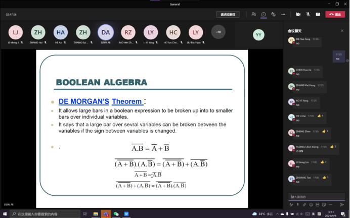 Ali Dziri教授讲授的《数字电路设计(Digital Circuit Designs)》课程为期2天,分别为9月7日、9月8日,共8个学时。他主要讲述了数字电子技术的基础理论、基本分析方法、测量技能和基本电路设计方法这四大部分内容,并详细介绍了逻辑代数的基础知识和门电路。在课堂上,Ali Dziri教授循循善诱,采用了提问互动的形式,活跃课堂气氛,与学生们深入交流,激发学生对学科的浓厚兴趣。课程最后,教授还特意出了几道有关课程的基础题目,检查同学们对课程的掌握情况。
