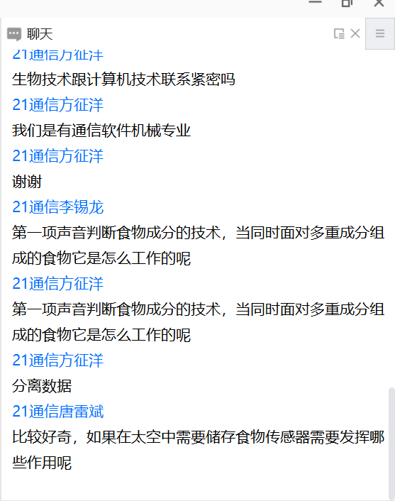 在交流环节中,同学们踊跃提问,提出了许多富有创意且实用的问题,如面对复杂成分的食物传感器怎样有效工作、传感器在太空食物储存技术中的应用、以及在生物打印技术相关传感器的应用场景等,何博士耐心倾听了同学们的提问并一一解答。针对同学们关于生物打印技术相关传感器发展前景等相关疑问,何博士指出,传感器在未来各项生物领域中发挥的作用重大,发展前景广阔。同时,他也鼓励同学们要敢于创新,开拓思路,为科学研究出一份力。