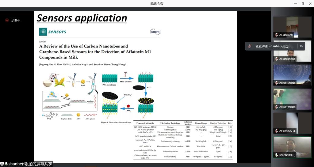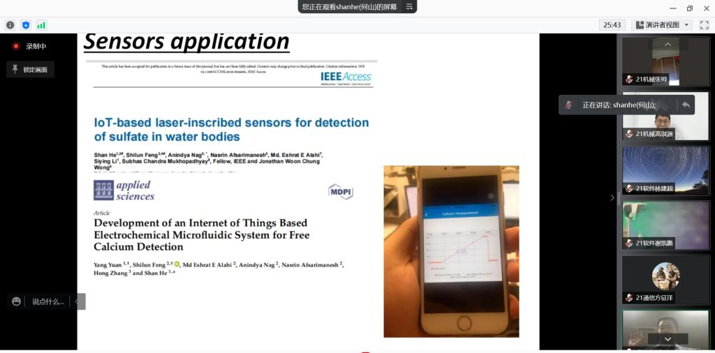 随着时代的发展,当今世界人们所面临的健康问题越发突出,其中食品安全是重要的影响因素,因此,食物摄入量的检测已经成为重要的研究领域之一。另外,传感器的应用越来越普遍且广泛,衣食住行等方方面面皆有传感器的身影——可穿戴和非可穿戴软材料传感器在监测食物摄入相关活动中发挥着关键作用。何山博士以许多生动的例子为同学们讲解了各类传感器在食品安全领域的应用,还提及了在细菌传感系统(Bacterial sensing system)、摄像机传感系统(Camera-based sensing system)、压电传感系统(Piezoelectric-based sensing system)、麦克风传感系统(Microphone-based sensors)中的作用。此外,何博士还阐述了当前传感器发展所面临的挑战。