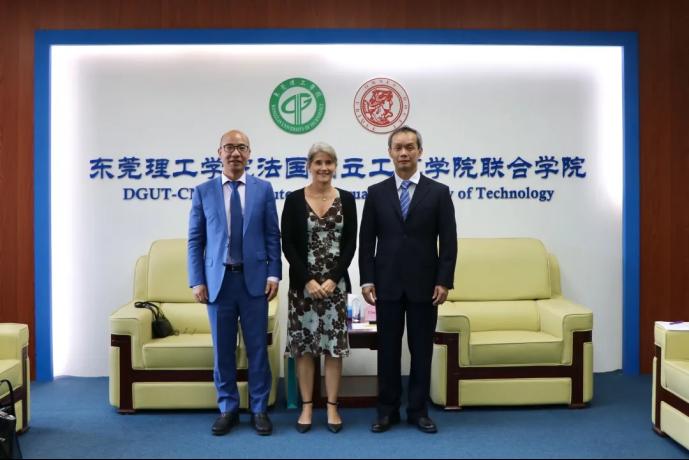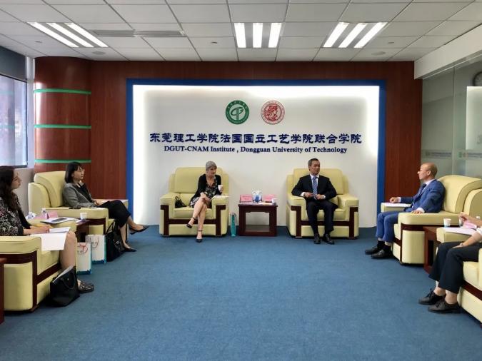 2020年10月22日,法国驻广州总领事馆文化教育合作处科技与高等教育领事裴安彤博士,科技合作官员赵卉瑜,高等教育合作项目官员李梦曦一行到访东莞理工学院法国国立工艺学院联合学院(以下简称:莞工sunbet官网),莞工sunbet官网执行院长陈毅华、副院长张明军等与来宾举行座谈。