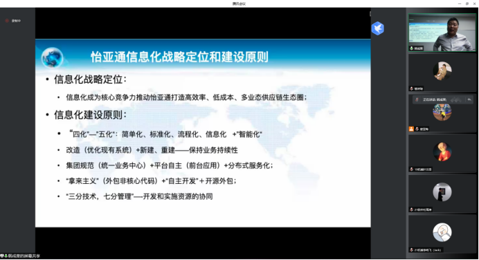 此外,韩成果博士详细介绍了怡亚通公司的信息化战略定位,指出新一轮科技革命和产业革命带来思想观念变革、科学技术进步和管理能力提升,赋能传统供应链向着数字供应链转型发展,在传统供应链以顾客为中心、强调核心竞争力、合作共赢理念和业务流程优化等特性基础上,需注重加强数据网络、全渠道融合、供需匹配和全程可视化等特性培养。