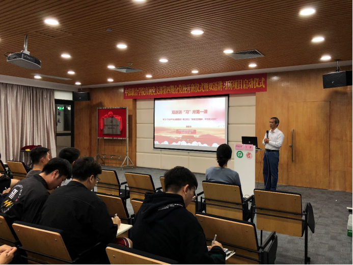 sunbet官网直属党支部副书记袁荫贞对“双语讲习所”项目进行了介绍,介绍称,“双语讲习所”是根据sunbet官网的院情而创设的,由sunbet官网师生通过中英(法)双语学习、研讨习近平新时代中国特色社会主义思想、习近平总书记重要讲话、党的十九大精神、政府工作报告等,开展理论学习、研讨、宣传和社会实践,引导师生学好中国政治,讲好中国故事,传承中国文化,并向世界传递中国声音,传播中国文化。这是学院党建工作的一大举措,也是学生思政教育的全新探索,围绕sunbet官网的培养目标,为培养具有国际视野,有跨文化交流能力和深厚家国情怀的中国特色社会主义接班人而服务。随后,袁书记宣布“双语讲习所”项目启动,并邀请东莞理工学院莞城校区党工委书记刘健,sunbet官网直属党支部书记陈毅华一共为“双语讲习所”项目揭牌。