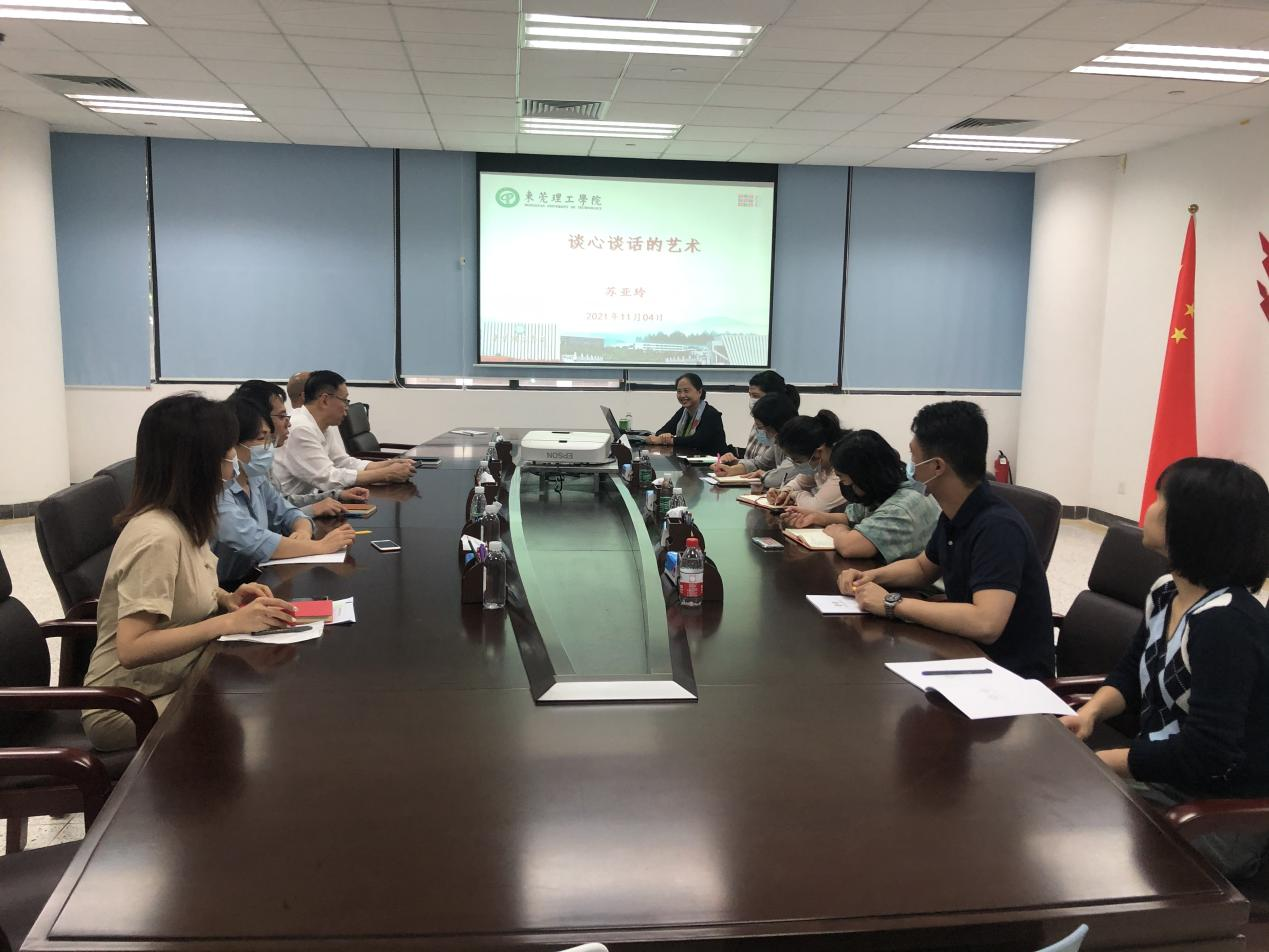 为更好地开展学生工作,2021年11月4日下午,我院有幸邀请到广东省教育厅、东莞市政府突发事件应急管理心理专家、东莞市心理咨询师协会会长苏亚玲副教授,以“谈心谈话的艺术”为主题为我院教职工开展专题培训。