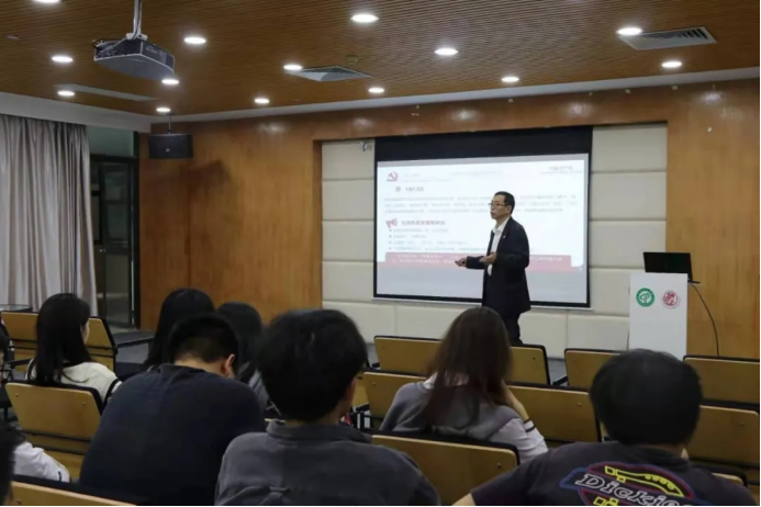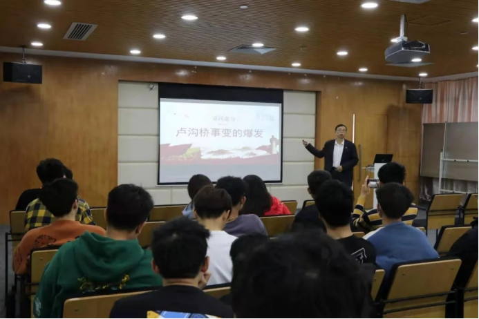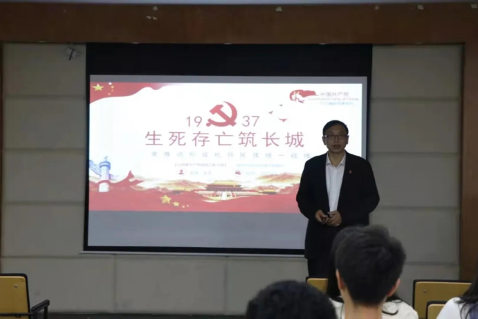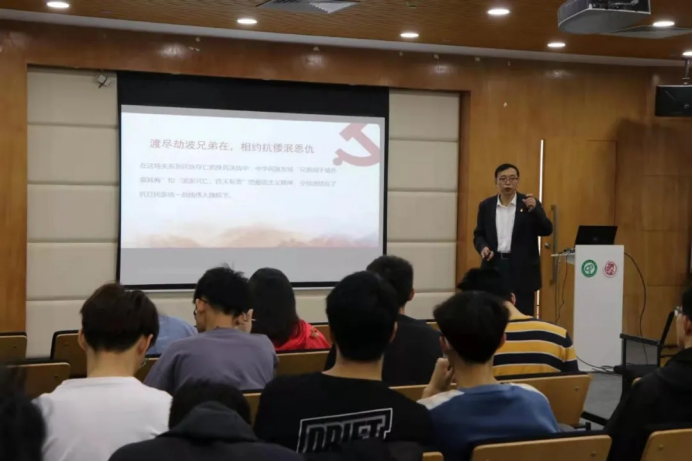 他以中国共产党抗日胜利为缩影,鼓励同学们,作为中国当代新青年,要怀着热忱的爱国主义情怀,发扬中国共产党的优良传统,坚持深入学习,坚持与实践相结合,应用到学习、生活中去。