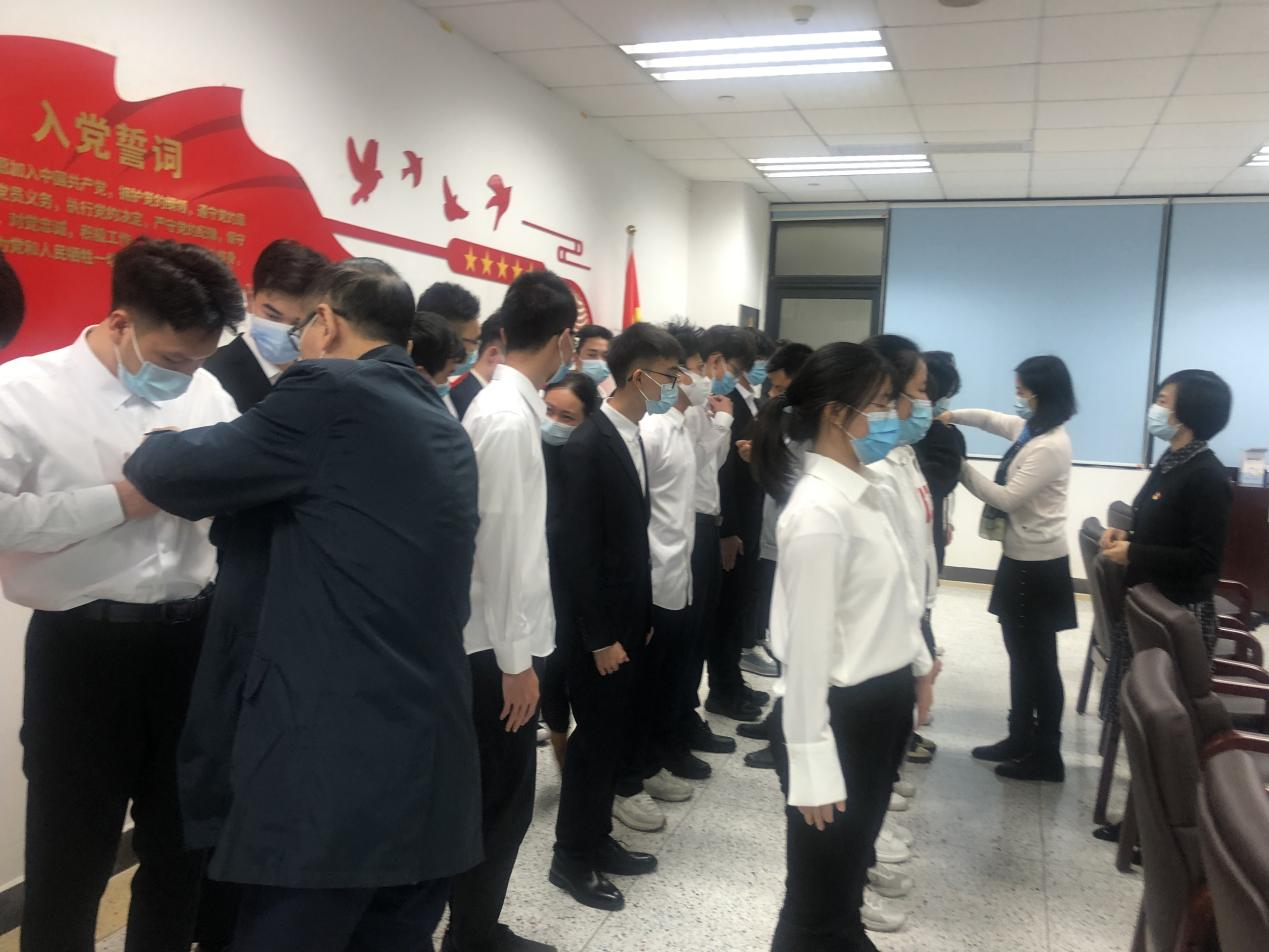 随后,会议郑重表决、通过了第五期入党积极分子名单;表决、接收了直属党支部第六批发展对象入党。各位发展党员分别经过了个人阐述、宣读政审报告、介绍人发表意见、票决等环节,最终12名发展对象全部通过表决,接收为预备党员。全体新党员进行了入党宣誓,老党员一并重温誓词。直属党支部副书记王玉,组织委员、副院长尹玲,宣传委员陈晓敏为预备党员佩戴党员徽章。