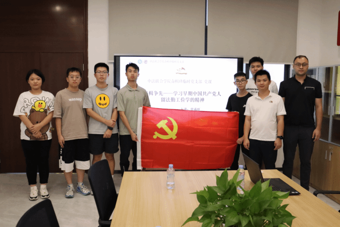 随后,奋楫班临时党支部书记曾淼旺以“奋辑争先——学习早期中国共产党人留法勤工俭学精神”为题开讲党课。在党课中,大家一同观看了记录留法勤工俭学运动历史的电视剧《我们的法兰西岁月》中,邓小平留法勤工俭学期间在法国工厂里工作的视频。曾书记向大家介绍了中国共产党人早期留法在工厂勤工俭学的情况,对中国共产党成立的重要影响,归国后对新中国建立的伟大贡献,并勉励奋楫班的学生学习留法勤工俭学的进步青年,积极学习留法勤工俭学运动历史,积极传承红色基因,不怕苦不怕累,在企业中认真学习实习,勇挑新时代赋予我们的责任和使命。