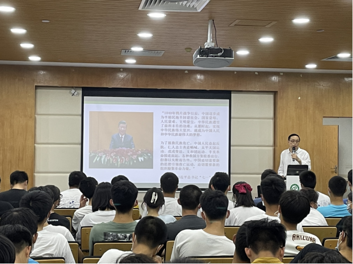 课上,sunbet官网直属党支部副书记王玉带领学生们一同学习了习近平总书记《在庆祝中国共产党成立100周年大会上的重要讲话》,从习近平总书记“七一”重要讲话的重大意义,全面建成小康社会的历史性成就,中国共产党团结带领人民不懈奋斗的光辉历程和伟大成就,伟大建党精神的深刻内涵和时代价值等几个方面,带领全体新生深入领会习近平总书记“七一”重要讲话精神。