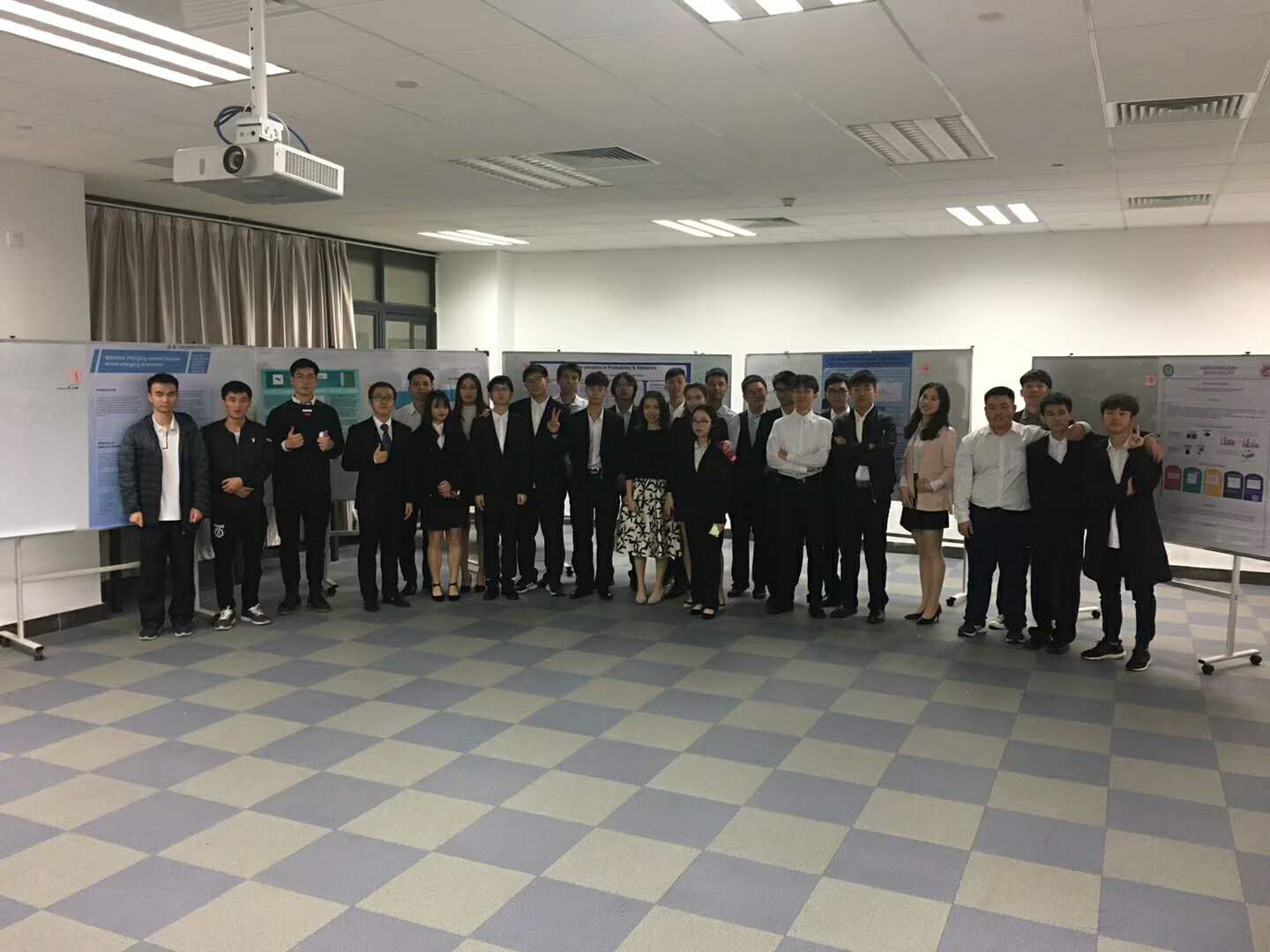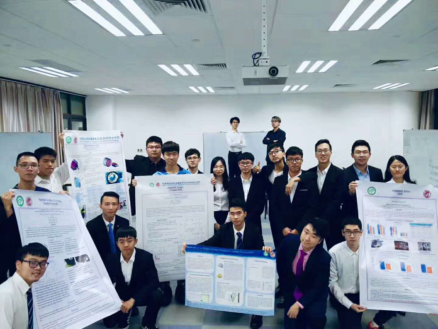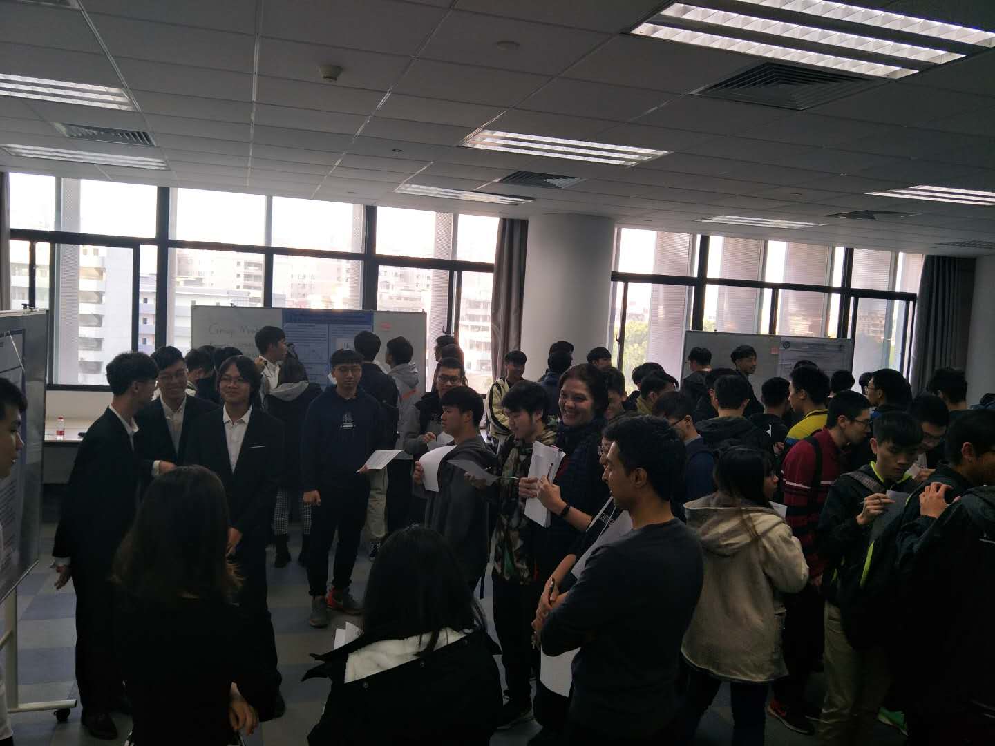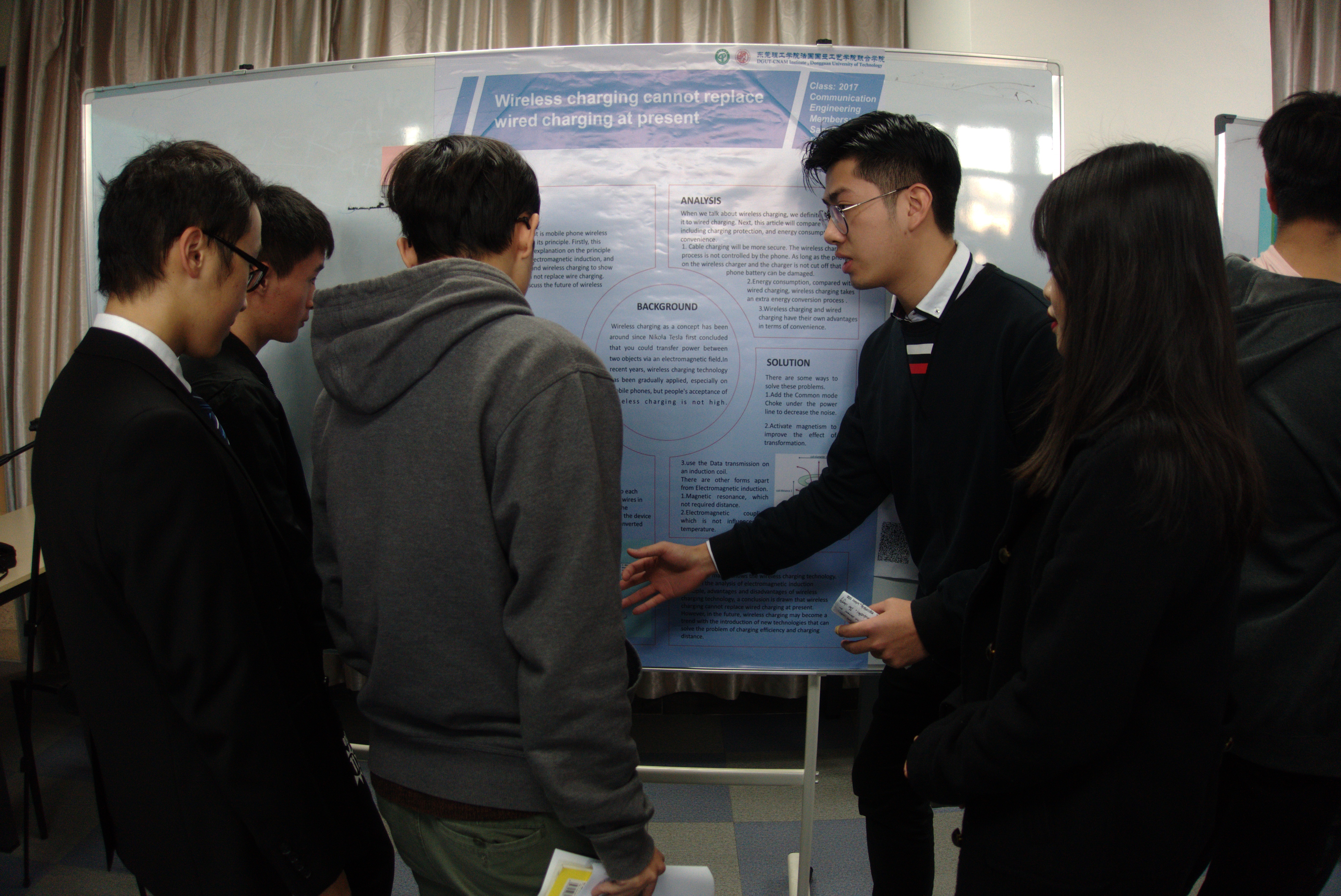 在为期五天的学术海报展览中,我院2017级通信,机械,软件三个专业的同学以组为单位,分组展示了其学术海报。这次展示包括分组全英陈述,观众自由提问,以及评分三个环节。在全英陈述环节中,各小组成员从海报架构,研究方向,研究意义以及研究领域前沿性等内容向参加展示的观众作详细介绍。在小组陈诉完毕后,观众针对海报内容以及陈述进行提问,小组成员作详细解答。最后观众根据海报设计内容(包括版面,用语准确性,详细性),小组陈述的专业性以及现场提问回答的反馈等各方面对每组的表现进行打分。