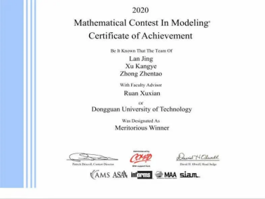 美国大学生数学建模竞赛(MCM/ICM)由美国数学及其应用联合会主办,是著名的国际性数学建模竞赛,也是世界范围内最具影响力的数学建模竞赛之一。赛题内容涉及经济、管理、环境、资源、生态、医学、安全、等众多领域。2020年4月,sunbet官网学生(蓝靖、徐康业、钟镇涛)喜获2020年美国大学生数学建模竞赛(MCM/ICM)的Meritorious Winner(一等奖)。据了解,这也是东莞理工学院学生历年来参加该项比赛所取得的最好成绩
